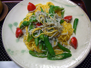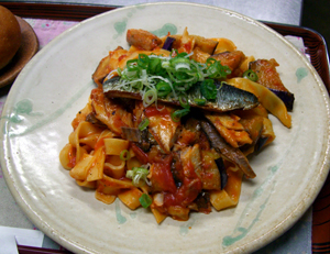 さんまのマリネソテーとつわの産なすびとシシトウのジェノバソース ~フェットチーネ~