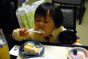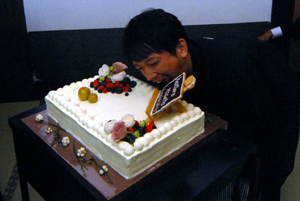 ケーキカット・・・この2人、思いっきりケーキを・・・