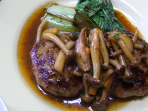 ハンバーグを焼いているところにきのこ類を入れ醤油とバターでソースを作りました。