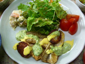 カマスを3枚おろしにして食べやすく骨もとり、マヨネーズ系の2色のソースにしました。