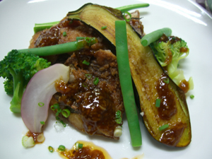 - ミートソース丼 揚げ賀茂ナス・温泉卵添え