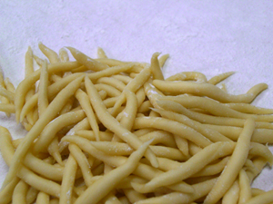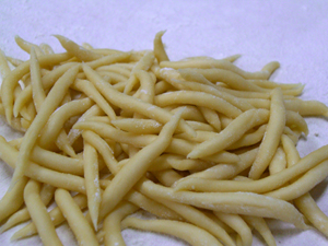 ベーコンとつわの産イモの茎のトマトソース 〜トロフィエ〜